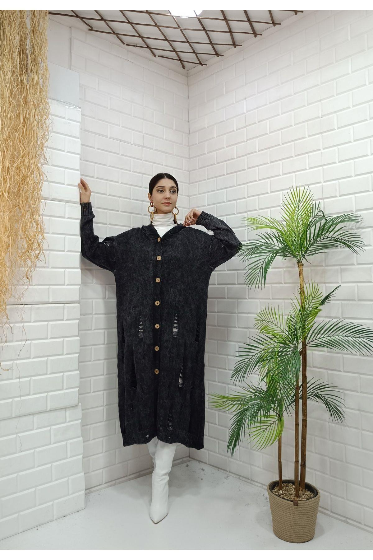 Kadın Kapüşonlu Önü Düğmeli Yırtık Detaylı Ceket Hırka