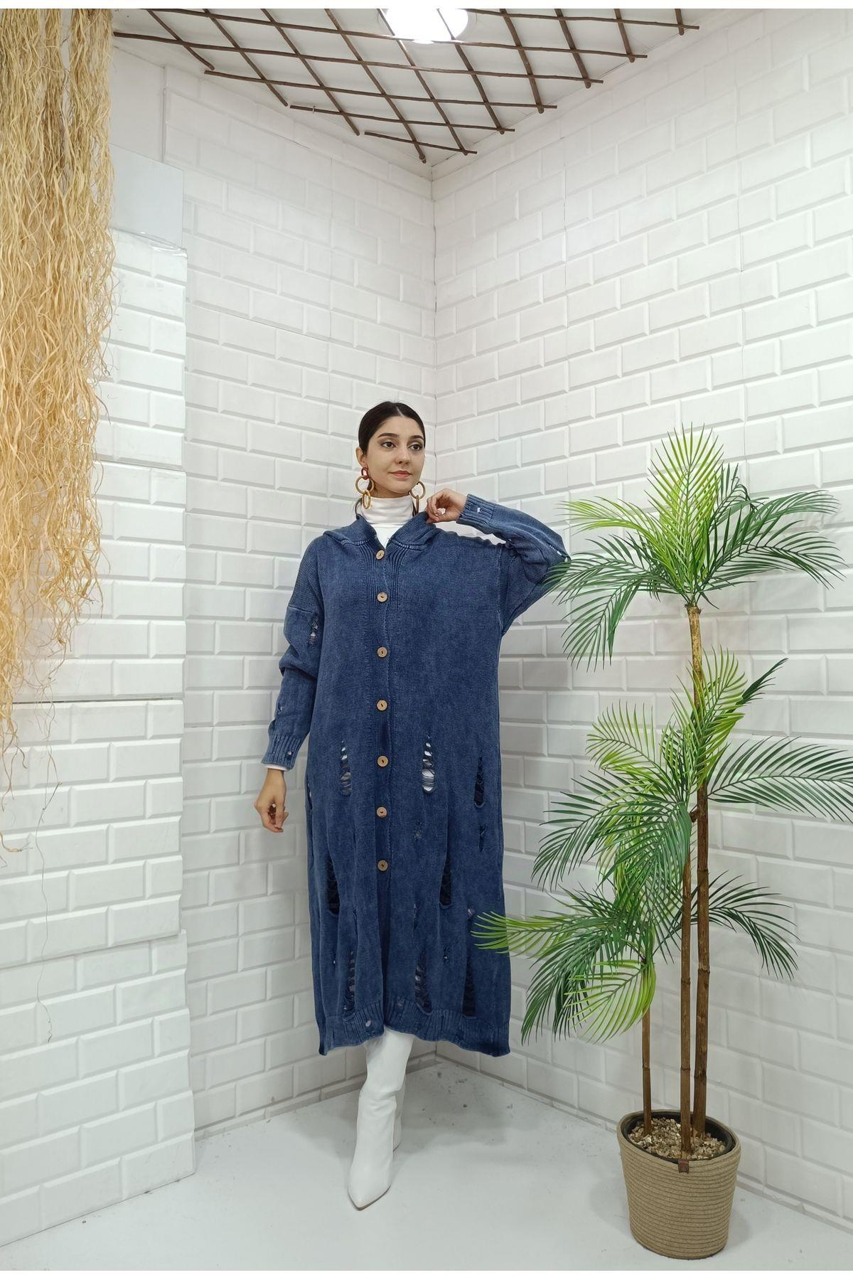 Kadın Kapüşonlu Önü Düğmeli Yırtık Detaylı Ceket Hırka